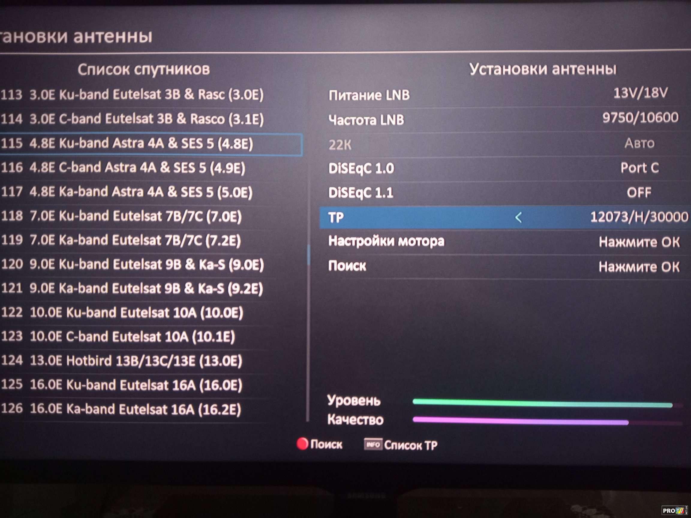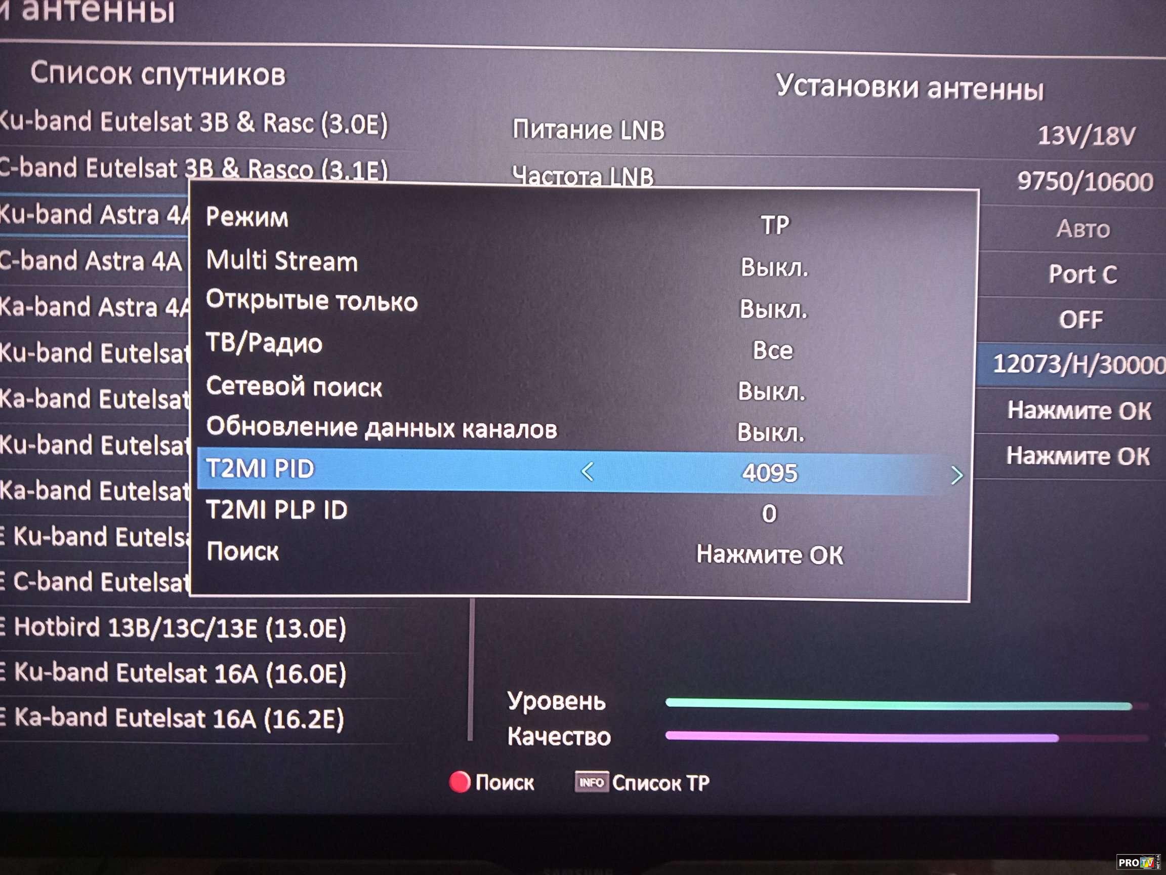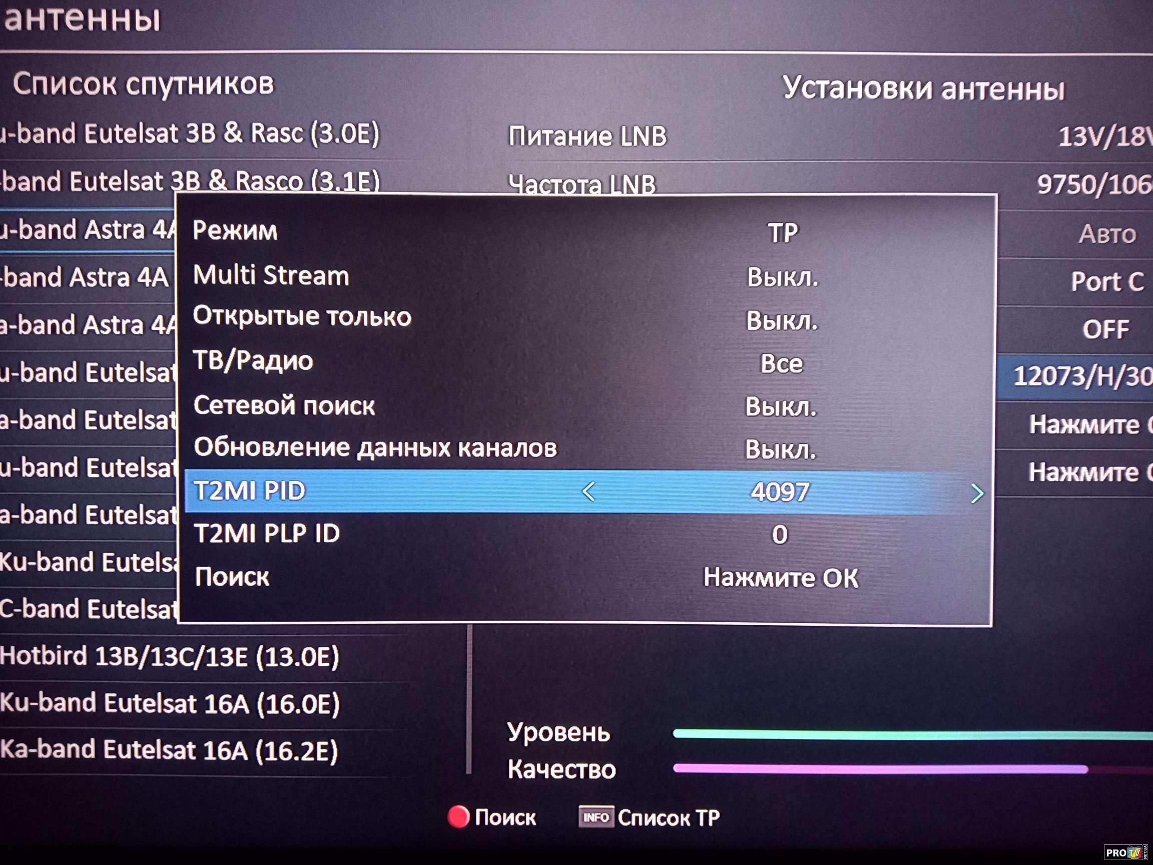 Недавно появился транспондер 12073 H 30000 2/3,DVB-S2/8PSK который имеет два T2MI PID - это 4095 и 4097,где каждый имеет примерно по 8 каналов. Так как ранее на ресивере Ustym 4K PRO по умолчанию была функция авто T2MI PID,но к сожалению при сканировании этого транспондера она не срабатывала так как в потоке повторю два T2MI PID. (Также по умолчанию в софте есть MULTI PLP который при одинарном скане сканировал все PLP за один раз.) По этой ситуации буквально недавно обратился в поддержку UCLAN,чтобы они всё таки реализовали ручной ввод данных T2MI PID и PLP для того,что бы можно было полноценно сканировать в одном транспондере несколько T2MI PID. Сегодня получил тестовый софт и протестировал! ВСЁ СКАНИТ И РАБОТАЕТ! Молодцы UCLAN! И так несколько фото данного теста транспондера 12073 H 30000 2/3,DVB-S2/8PSK который имеет два T2MI PID - это 4095 и 4097 Заходим в настройки спутника -создаём или находим транспондер и нажимаем поиск.
