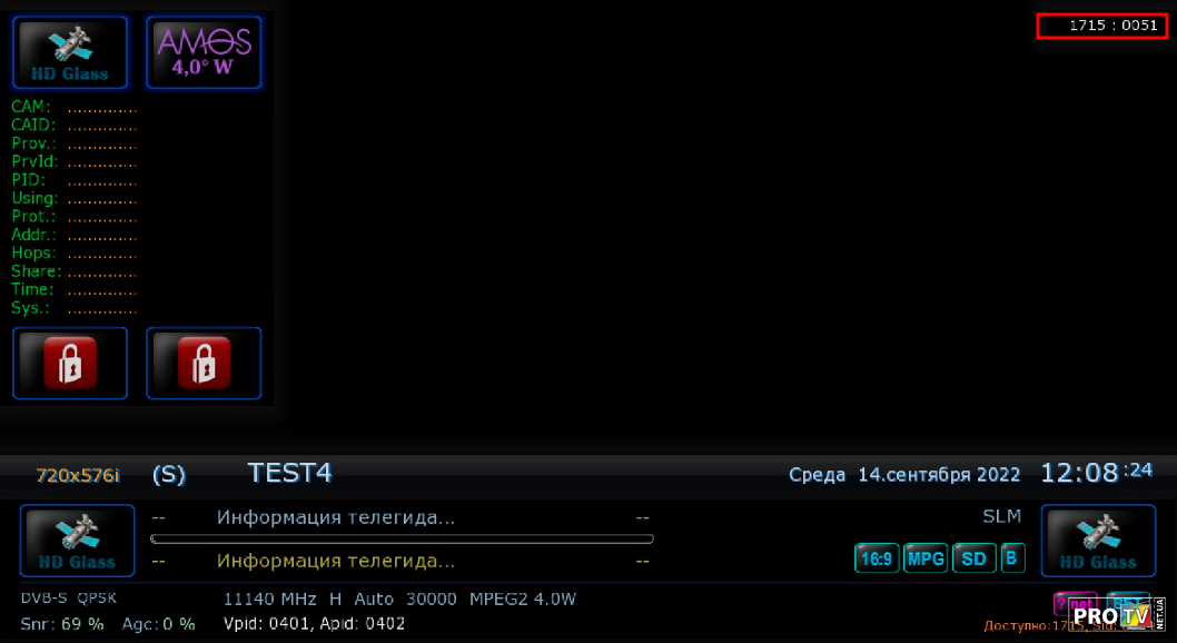 На 11140 H, 30000, DVB-S сервис TEST4 закодирован Verimatrix (CAID 1715):